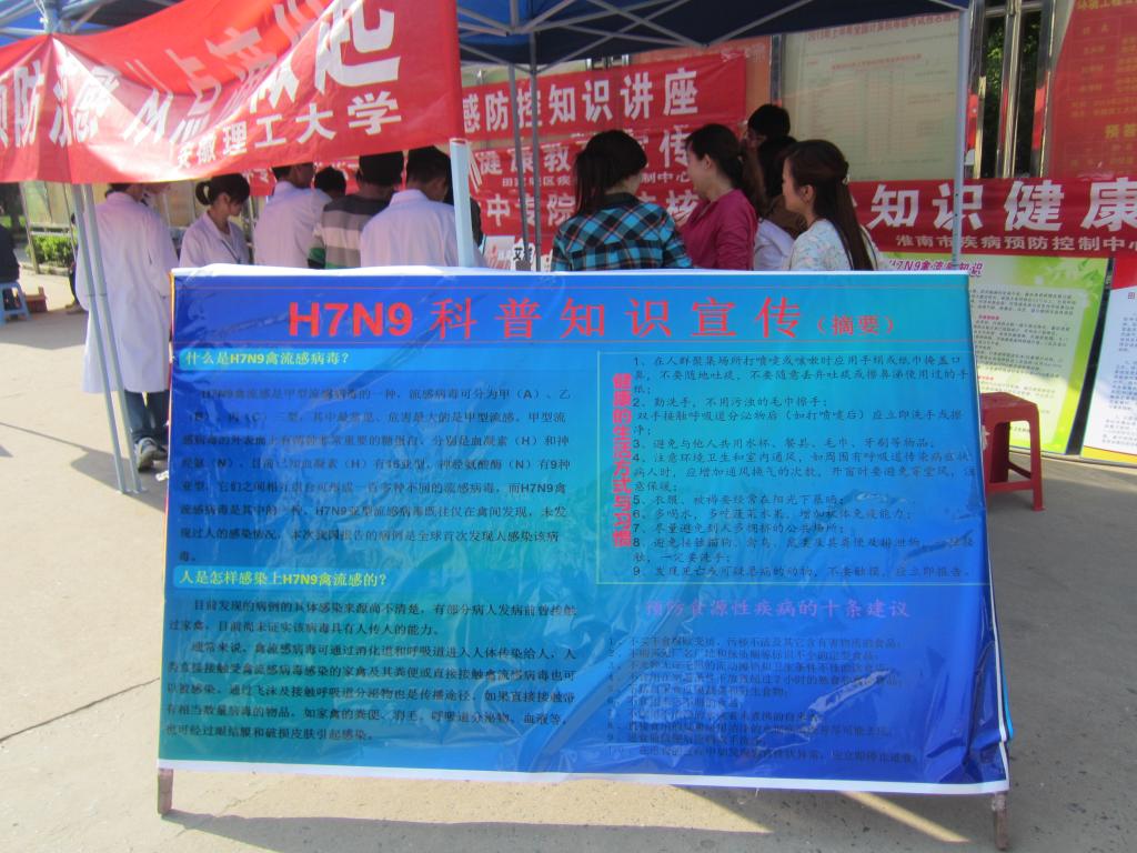 春季为传染病多发季节,目前我国多地发生H7N9型禽流感感染事件,为做好禽流感等春季传染病的防控工作,增强人们对禽流感疾病的关注和重视,做好流感预防工作。4月26日,化学工程学院联合疾控中心、医学院、计算机学院共同开展了以“预防H7N9禽流感”为主题的公益活动。