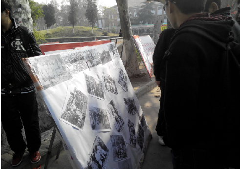 本次活动主要对于校内大学生展开,早上8点,志愿者们来到爱情湖畔,搬来桌凳,将写有“停下你的脚步,望望76年前南京的天空”的横幅平铺于桌面,然后将活动展板竖于横幅的前面,展板上展示了许多发人深省的侵华日军对南京同胞施加暴行的图片。临近放学的时间,活动现场来往的同学们越来越多,他们纷纷驻足展板,看着一幅幅令人深感悲痛的图片,然后拿起志愿者准备的笔笔,为纪念这一耻辱的日子在横幅上签下姓名,留下了自己的爱国心。虽然现场人很多,但是没有喧哗,没有嬉笑,同学都积极的在横幅上留下了自己的姓名,为这一沉重的日子奉献一片自己的爱国情意。签名活动于14:00结束,横幅无一空白之处。活动结束后,志愿者们将满载签名的横幅挂在了大操场旁边,警醒同学们勿忘国耻,爱我中华。
