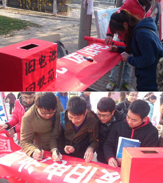 活动前,该专业同学在学校人流量较大的位置挂横幅、贴海报、做展板,并在班群和学院微博上广泛宣传。活动中,同学们带着贴有“废旧电池回收箱”标签的纸盒到达指定位置开展集中回收活动,同时,通过展板介绍、公益海报和同学讲解提醒大家随意丢弃废旧电池的危害性。来来往往的同学不时停下脚步,积极参与到活动中来,有的在横幅上签名,有的认真听讲解,有的跑回寝室取废旧电池。