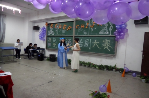 本次比赛共有来自两学院、八个班级参加。比赛中,幽默与创意成为最大亮点。新版喜洋洋与同伴们一起打败了灰太狼;梁山伯与祝英台悲伤的离别……同学们标准的英语与幽默的桥段彰显出了大学生的风采和朝气。经过2个小时的精彩比拼,应用化学13-1班的同学们以流利的英语和完美的表演夺得第一名。