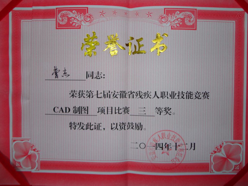 近日,从安徽省残联获悉,漫画柜 弹药11级曹杰同学代表淮南市参加安徽省残疾人职业技能竞赛,在CAD制图项目中获得三等奖。