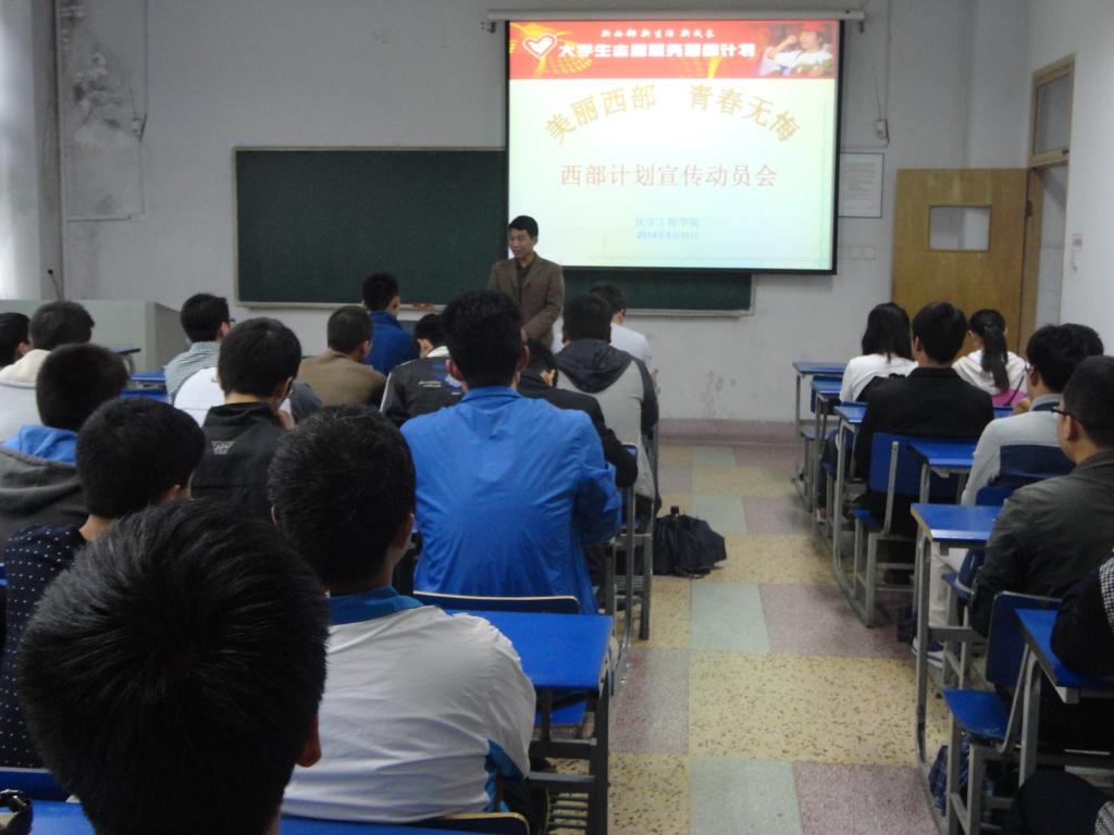 5月11日上午,化学工程学院在新教1102教室组织召开2015年大学生志愿服务西部计划动员宣讲会,宣传“西部计划”相关内容,鼓励毕业班学生积极报名、到广阔基层建功立业。学院党委副书记徐泽绵、团委副书记杨志华及40余名同学参加了会议。
