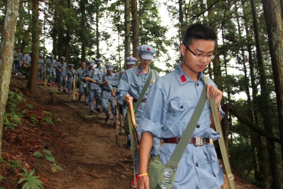 下午,我们实践团头戴红军帽,身穿红军服,佩戴步枪,双脚打上绑腿,一个个英姿飒爽、精神抖擞来到黄洋界,这是有朱毛红军当年的挑粮小道,我们的任务就是重走这条革命之路。行至半道,下起了雨,越来越大,然而并没有浇灭我们要抵达目的地的信心和决心。在基地安全组织下,我们互相帮扶和鼓励,一边大声唱着红歌安全返回。