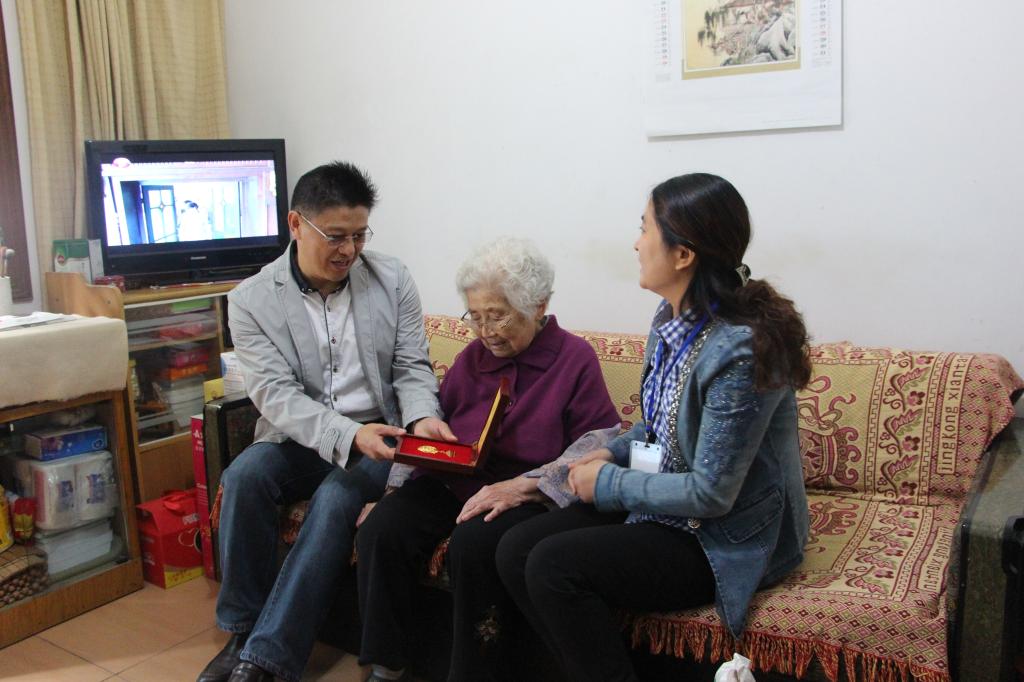 徐冬生、徐泽绵等来到师全智、杨琦霞、侴万禧三位老人家中,为他们送去油和米,表达节日的祝福和学院的关怀。杨琦霞老人作为女游击战士,参加过泗洪游击战;师全智老人早年参加革命,为新中国建立做出了自己的奉献。他们小心翼翼地取出纪念勋章,向大家介绍了当年抗战情景,让在场的师生为之感动和敬佩。