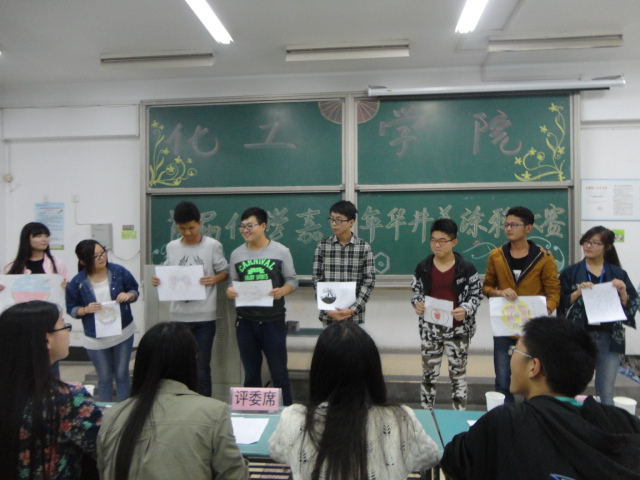 本次比赛以“化学嘉年华”为主题,提倡积极创新,用色彩美化生活。首轮比赛于5月27日晚在北实207举行,各选手携带自己的纸质作品参赛,并对作品的创意进行解说,由评委打分,排出名次。29日下午,进行次轮比赛,优秀作品作者在井盖上作画。参赛的十份作品各具特色,其中卫志超同学的作品《爱在化工》较为突出,作品内容寓意丰富且图案美观,用六种颜色代表化工学院的六个专业,各种实验仪器更是与化学息息相关,燃烧的酒精灯寄托了化工学院红火发展的美好愿望,评委对其作品也是一致好评。