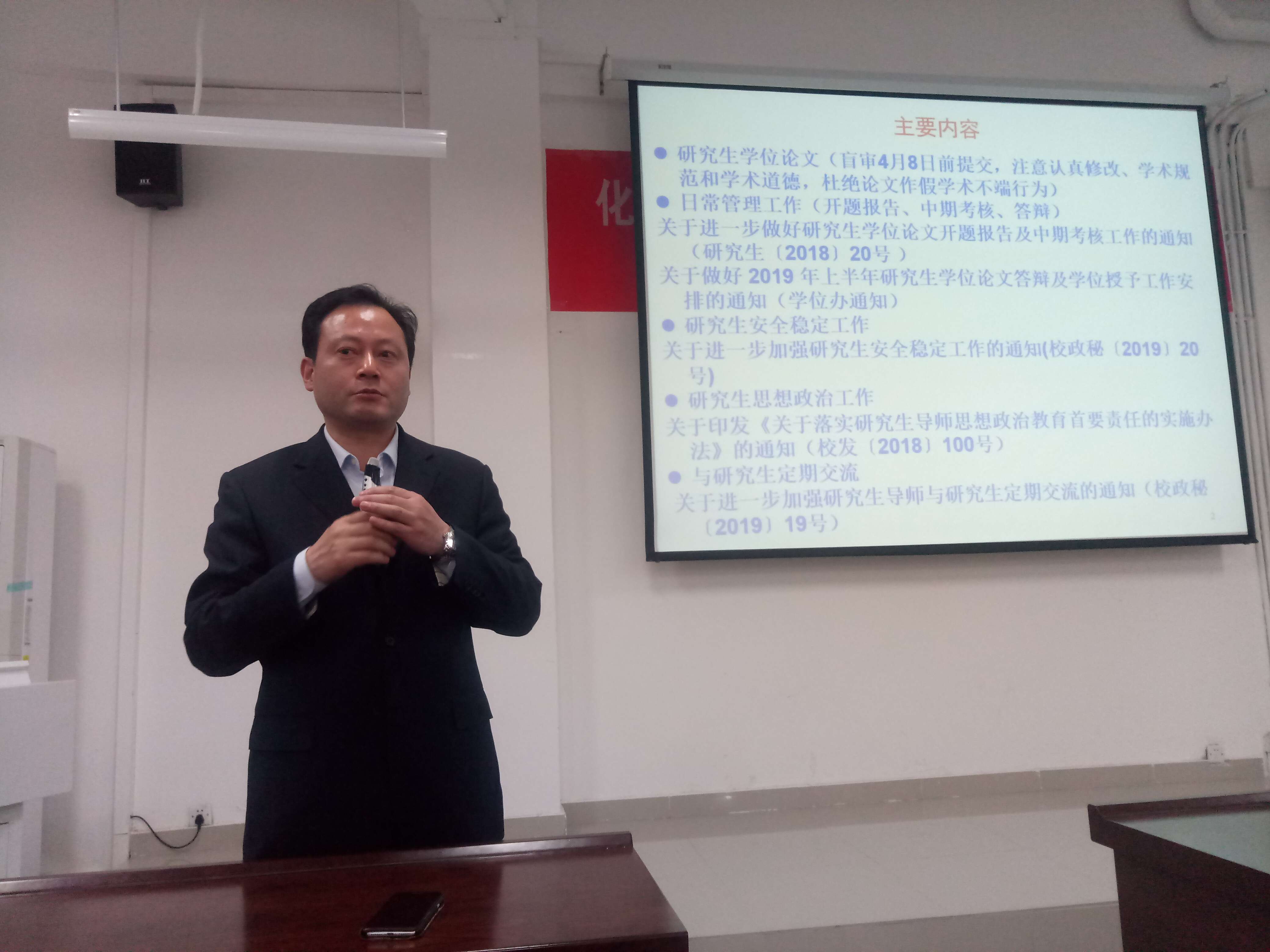 4月3日下午,化学工程学院在崇礼楼栋102会议室召开硕士生导师和研究生工作会议,邢宏龙副院长(主持工作)就近期研究生安全稳定工作进行安排部署。会议由武成利副院长主持,毕业硕士生和硕士生导师40余人参加会议。