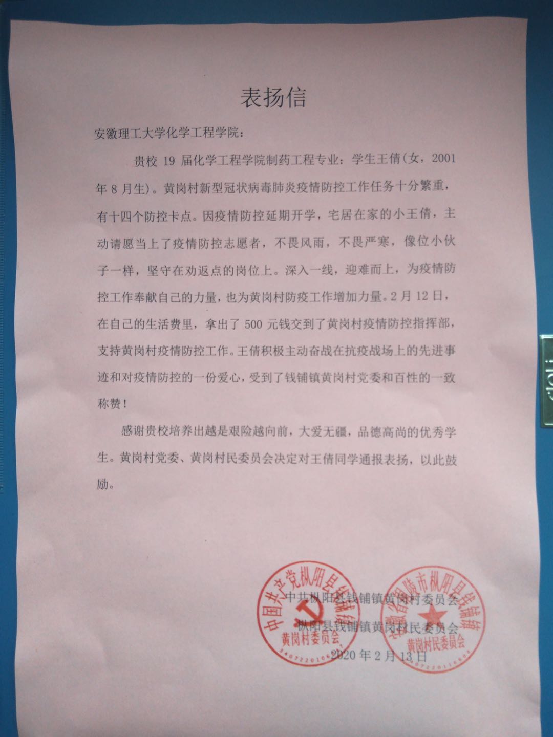2月13日,铜陵市枞阳县钱铺镇黄岗村疫情防控指挥部收到一笔500元的特殊捐款和一封志愿服务的信件,表明自己志愿参与新冠肺炎疫情防控,落款名为王倩。经核实,王倩为漫画柜 化学工程学院制药工程专业2019级学生,为此枞阳县钱铺镇黄岗村向化学工程学院发来表扬信。
