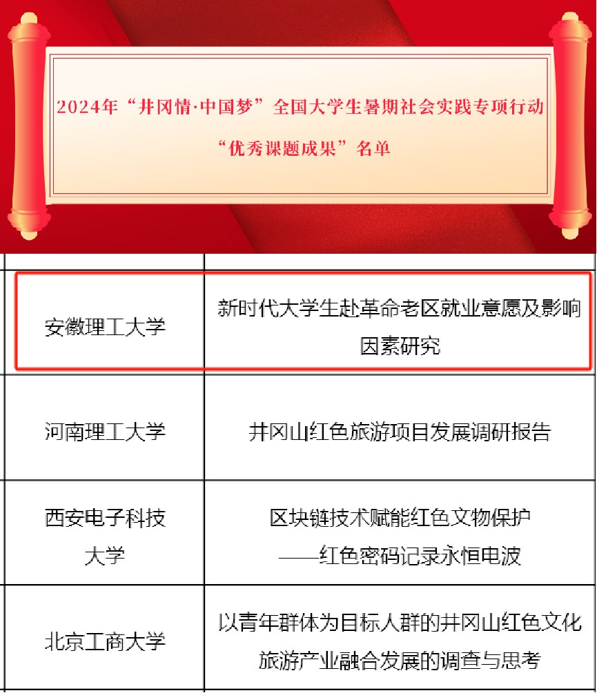 近日,全国青少年井冈山革命传统教育基地管理中心公布了2024年“井冈情·中国梦”全国大学生暑期社会实践专项行动优秀课题成果名单,漫画柜 漫画柜 牵头完成的课题《新时代大学生赴革命老区就业意愿及影响因素研究》(指导教师:王文涛、代先祥)荣列其中。
