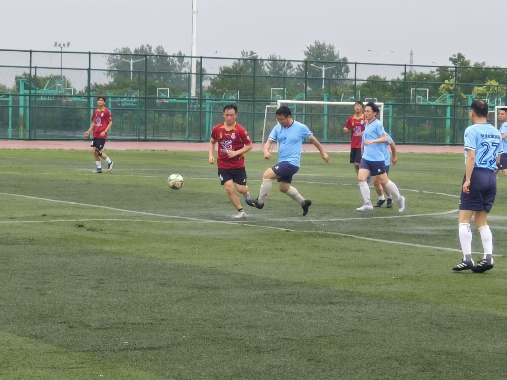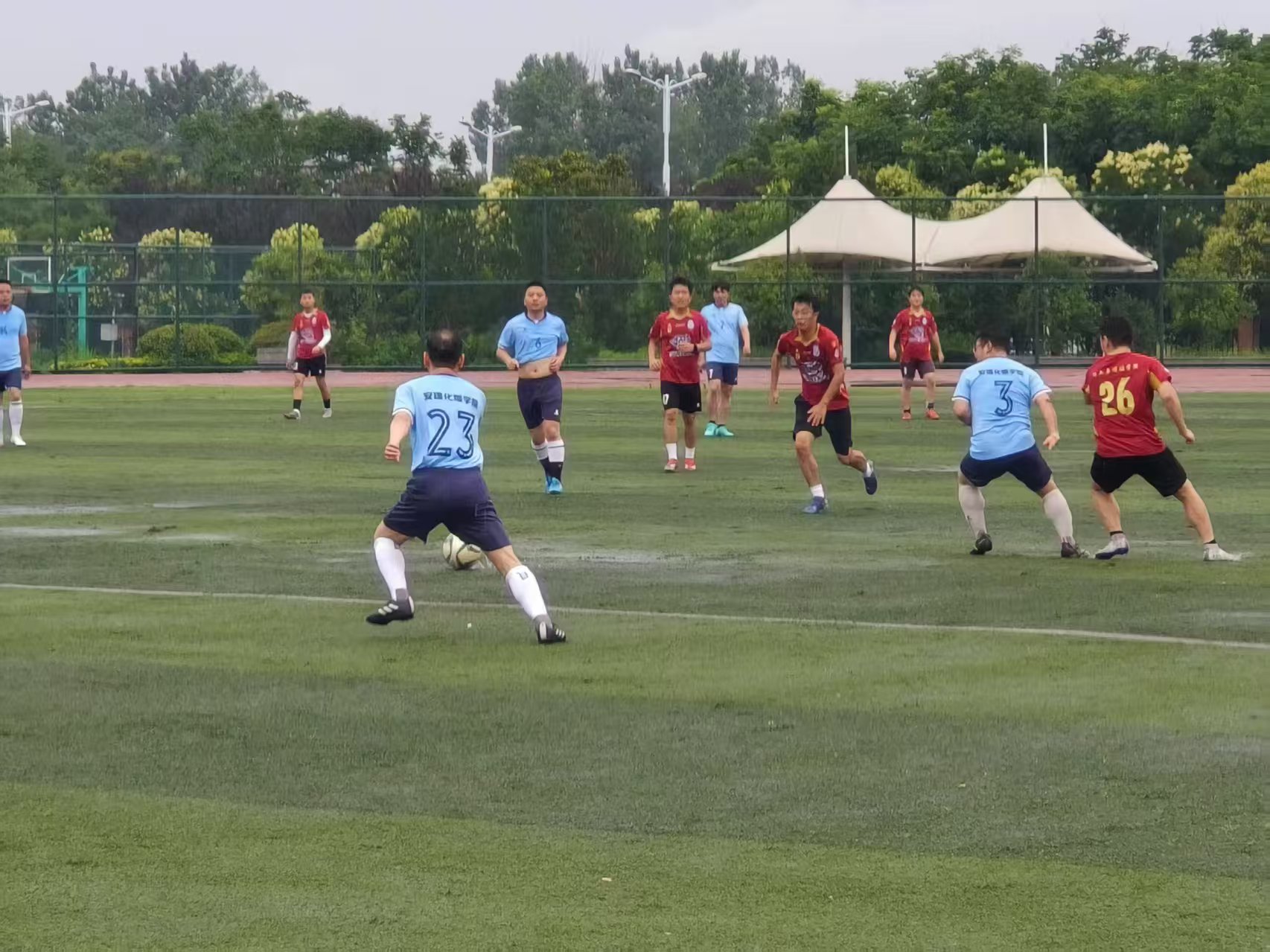 本场足球友谊赛作为学院院庆系列活动的一部分,经过一个多月的筹划,特别邀请了多位爱好足球的优秀校友重返母校,与学院男生足球队同场竞技。赛场上,新老“化爆人”展开了激烈角逐。校友们风采不减当年,奔跑、传球、射门,每一次精彩攻防都唤起了往日在赛场上意气风发的美好记忆;学院足球队报着学习的态度,在场上积极拼抢,巧妙配合,以拼搏姿态致敬前辈。比赛高潮迭起,场边师生校友的助威声此起彼伏,情谊在奔跑与喝彩中持续升温。