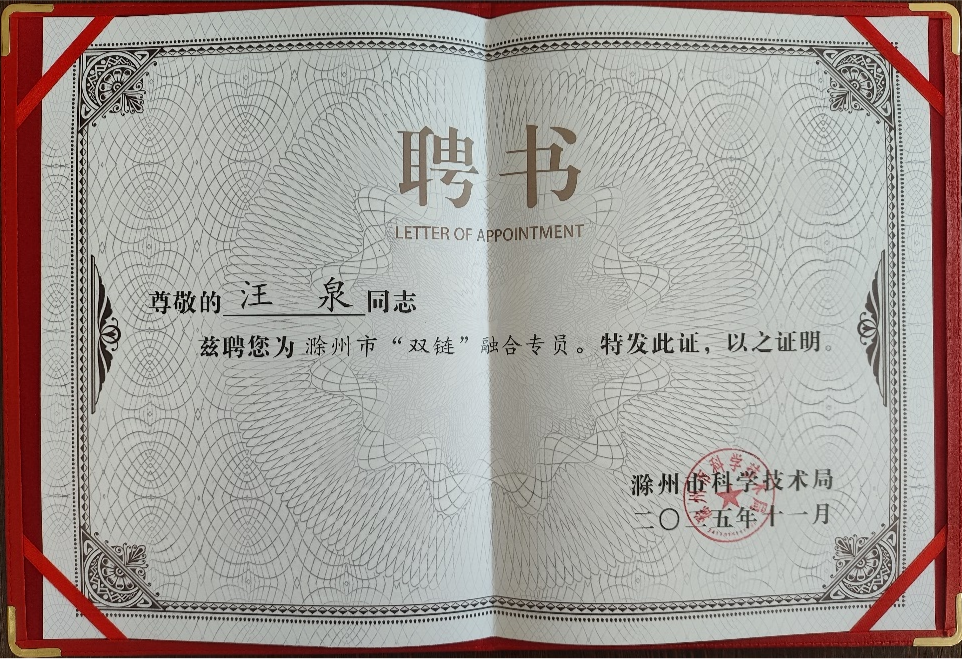 之后,滁州市政府举行“双链”(产业链与创新链)融合专员聘任仪式,学院汪泉院长与其他11位来自高校和科研院所的专家一同获聘为“融合专员”。