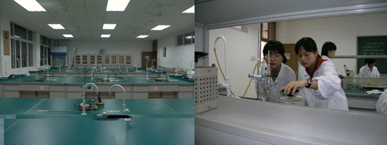 基础化学实验室始建于1978年,经过近30年发展,现有普通化学、无机化学、分析化学、有机化学、物理化学等实验室。实验室使用面积约2450平方米。经过最近几年学校对基础实验设施的大力投入,实验条件上了一个新的台阶。基础化学实验室目前拥有气相色谱仪、紫外-可见分光光度计、显微电泳仪、超声细胞粉碎仪、自动旋光仪、电子天平、光学显微镜等各类实验及分析仪器,仪器设备总值达250多万。化学实验也从原来的单纯地验证型逐步地向设计型、综合型和研究型过渡。现各实验课程都开设了综合设计型实验。
