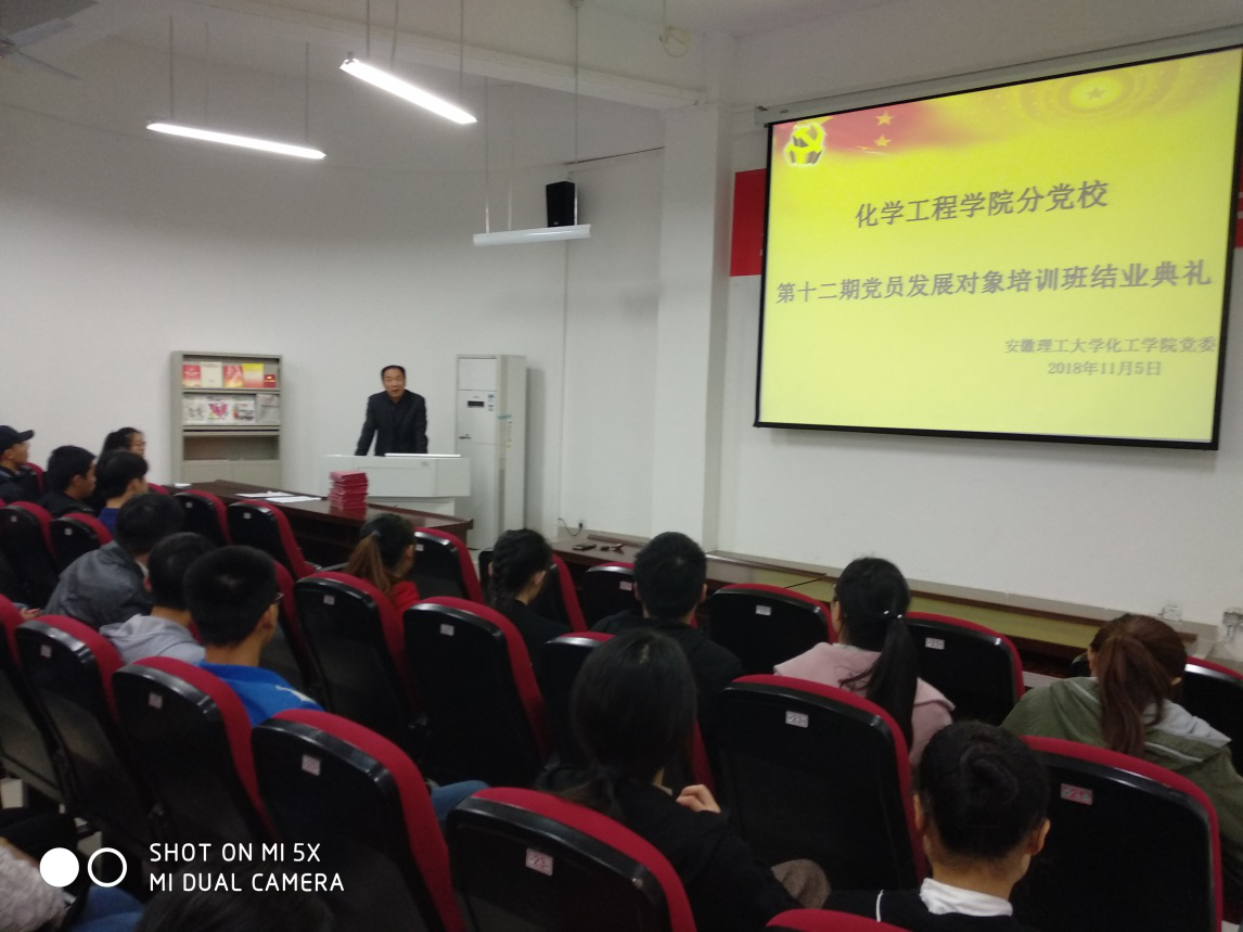 11月5日晚,化学工程学院分党校第十二期党员发展对象培训班结业典礼在化工学院楼东102隆重举行。分党校校长、学院党委书记王大贤出席典礼并讲话。培训班班主任和培训合格的学员参加了结业典礼。典礼由学院党委秘书主持。