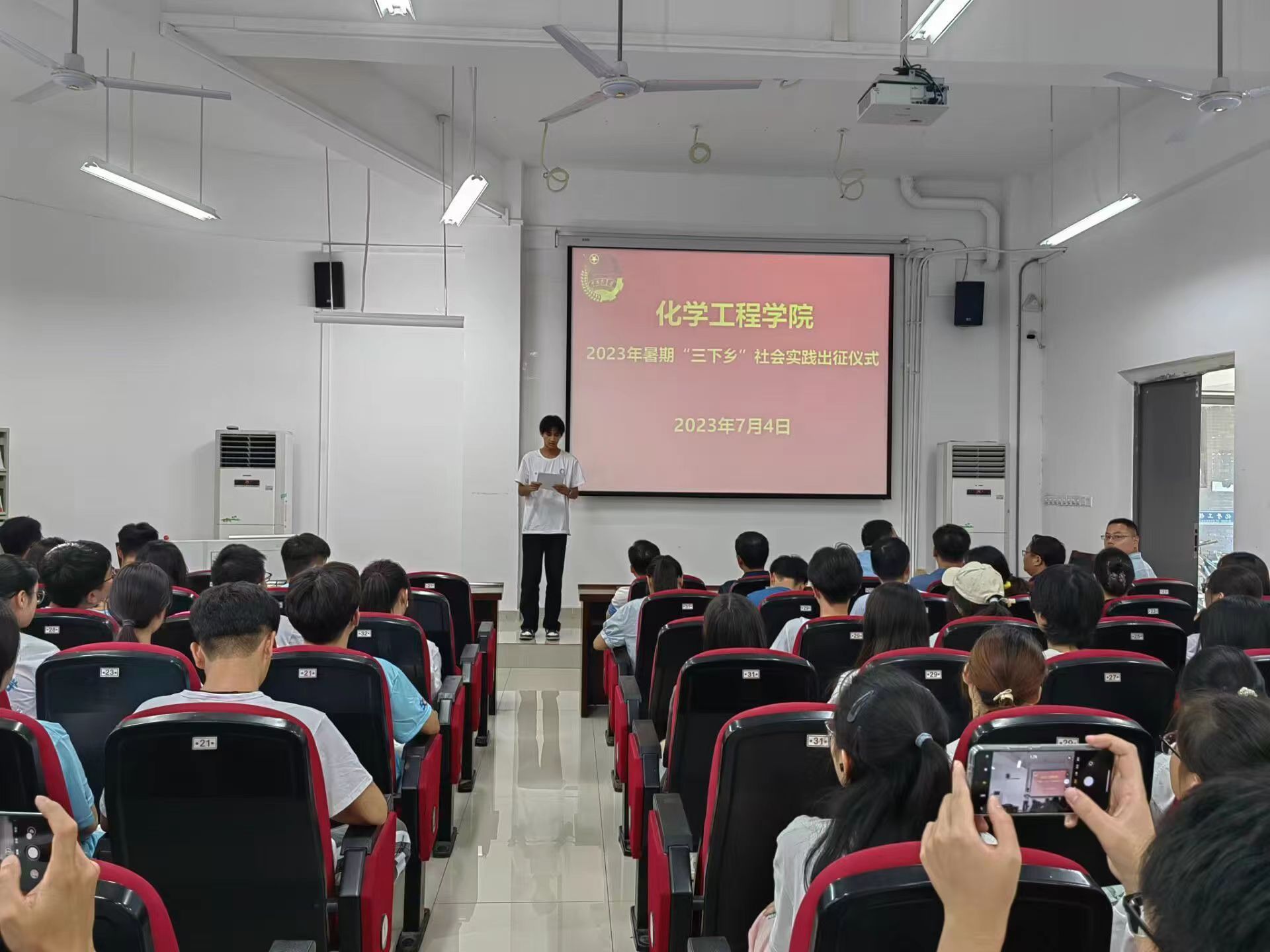 7月4日下午,化工学院2023年暑期“三下乡”社会实践出征仪式在学院东102报告厅隆重举行,学院党委书记徐泽绵、院党委副书记曹秀军、副院长(主持工作)武成利、副院长汪泉、副院长胡劲松,指导老师及全体社会实践团队成员代表100余人参与本次活动。