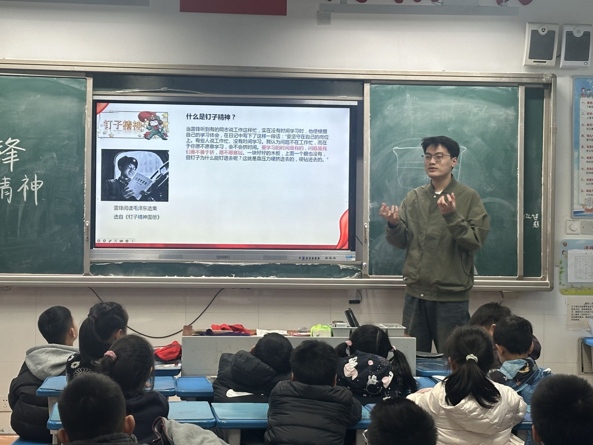 “雷锋叔叔为什么总愿意帮助别人?”“我们也能成为小雷锋吗?”宣讲现场,大学生以问题为引,通过“你问我答”“故事接龙”等环节,鼓励小学生畅谈对雷锋精神的理解。孩子们争相分享“高年级学生借我红领巾”“帮老师打扫卫生”等生活小事,稚嫩童声传递真挚感悟。活动尾声,大家一起学唱了《学习雷锋好榜样》,铿锵旋律中,雷锋精神如春雨般浸润童心。