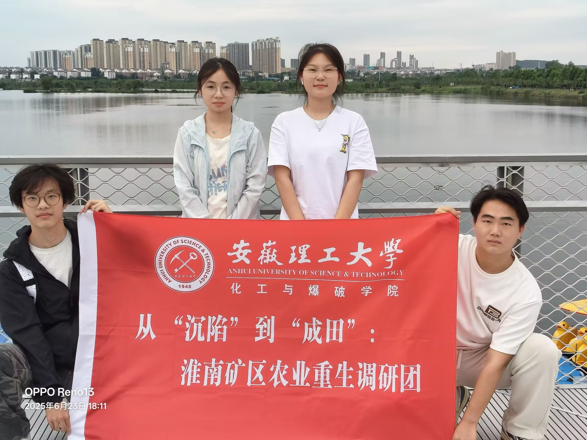 2025年7月1日,应用化学24-2班的四位志愿者怀揣着对生态修复的好奇与探索精神,奔赴春申湖公园,开启了以“从‘沉陷’到‘成田’:淮南矿区农业重生与可持续发展实践之旅”为主题的暑期三下乡社会实践活动。