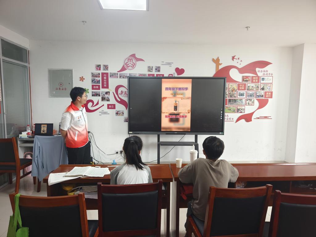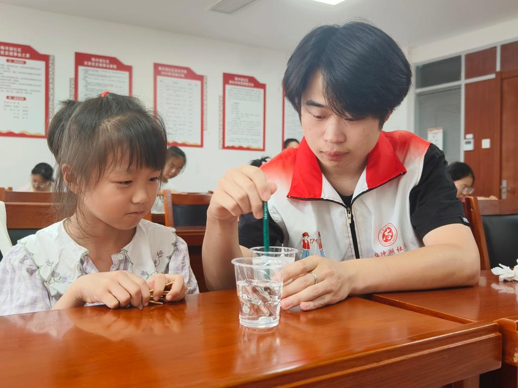团队针对社区留守儿童多、素质教育资源缺的情况,构建“基础+拓展”双轨课程。基础课程以作业辅导为主,融入趣味互动夯实知识,同步通过红色故事、影片厚植家国情怀;拓展课程设科普实验,借助“水的表面张力”实验,通过视频讲解,亲身示范,孩子们的动手操作,引导观察现象变化,培养对比分析、逻辑推理等科学思维,是启蒙孩子们科学探究能力的有效手段。