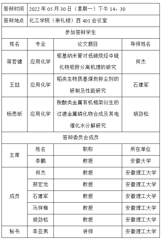 化学工程学院硕士研究生学位论文答辩公告(二)