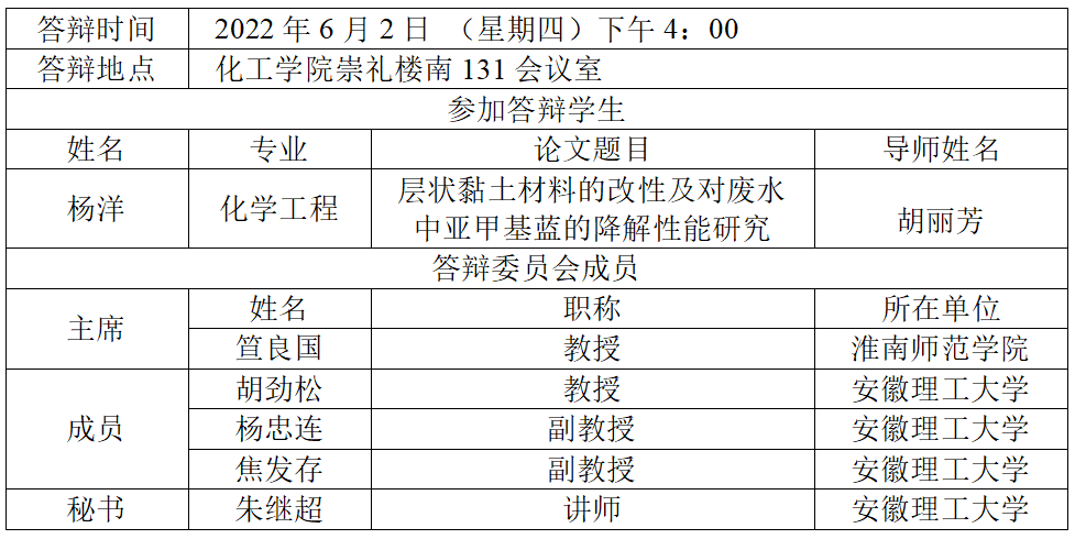 化学工程学院硕士研究生学位论文答辩公告(五)